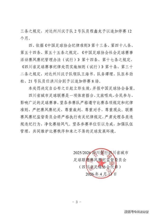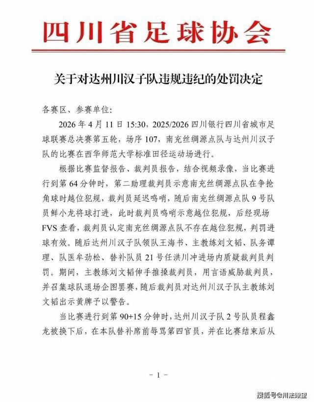 四川足协重罚川汉子队